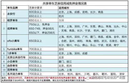一是通过芝麻信用分,分数达到600及以上可以免押金,涉及企业包括ofo、哈罗、永安行等,不同企业有不同的信用分要求。这也是目前共享单车平台推行免押金主要运用的途径。